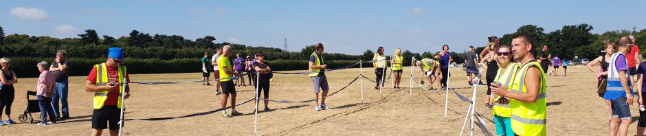 The morning came and we set off for Kesgrave in the car, arriving pretty early to find that there was plenty of parking. The parkrun takes place on the Millennium Jubilee Field in front of the Millennium Jubilee Hall which was resplendent with bunting. It got another tick in the box for me as there was a toilet – just the one but one is better than none! We’ve been having crazily hot weather across the UK over the summer and the grass on the Millennium Field looked scorched – almost like sand on a beach. I had had a really bad running experience a couple of weeks before when I became really dehydrated, so I started to worry about the lack of shade and getting dehydrated again, but before I could worry too much the new runners and tourists were gathered together for the New Runners’ briefing which was carried out by the enthusiastic and exuberant Tim. Then after the RD’s briefing held in front of the hall, and we lined up at the start ready for the off.